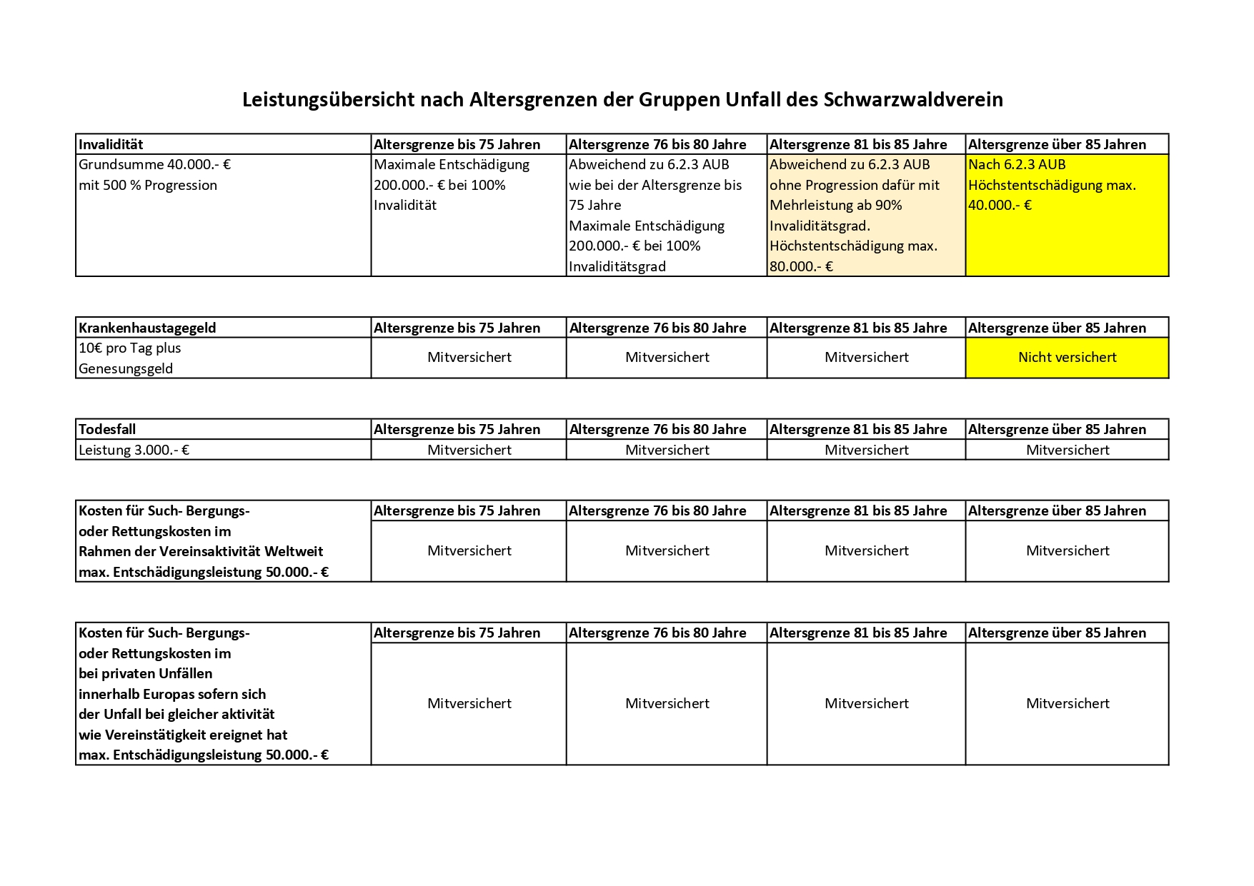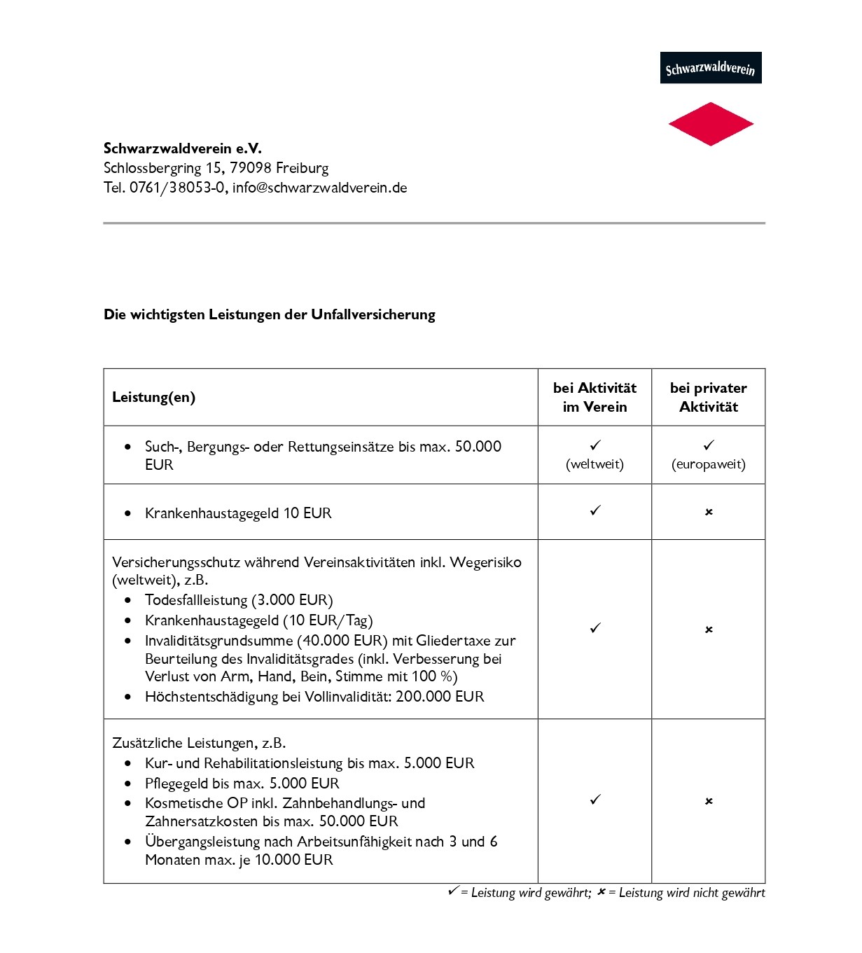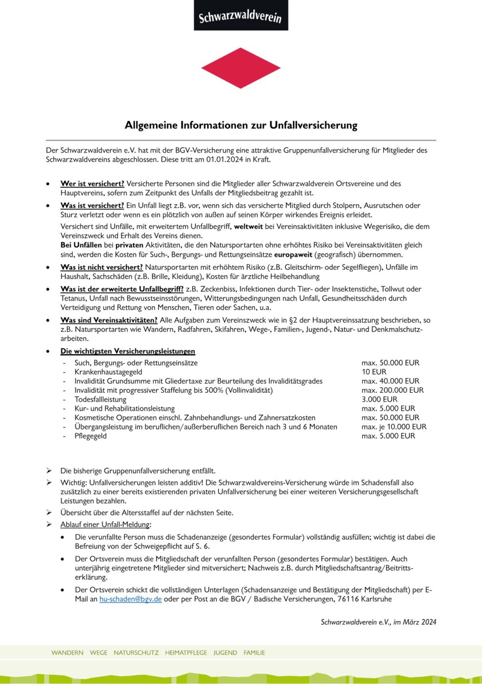 Der Schwarzwaldverein e.V. hat mit der BGV-Versicherung eine attraktive Gruppenunfallversicherung für Mitglieder des Schwarzwaldvereins abgeschlossen. Dabei sind unsere Mitglieder nicht nur im Rahmen der (Rad-)Wanderaktivitäten unseres Schwarzwaldvereins unfallversichert, sondern auch bei privaten Wanderungen. Nähere Informationen bitten wir untenstehenden Informationen zu entnehmen. Für Fragen stehen wir gerne jederzeit zur Verfügung.